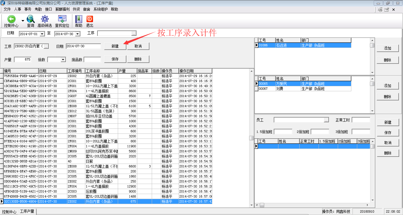 妙用之一,定制了按工序錄入每日計件資料,實現(xiàn)按每日工序的產量計算計件工資,輕松解決繁瑣工序產量多、節(jié)假日出勤的倍數及廢品數核算難的問題等,如下;